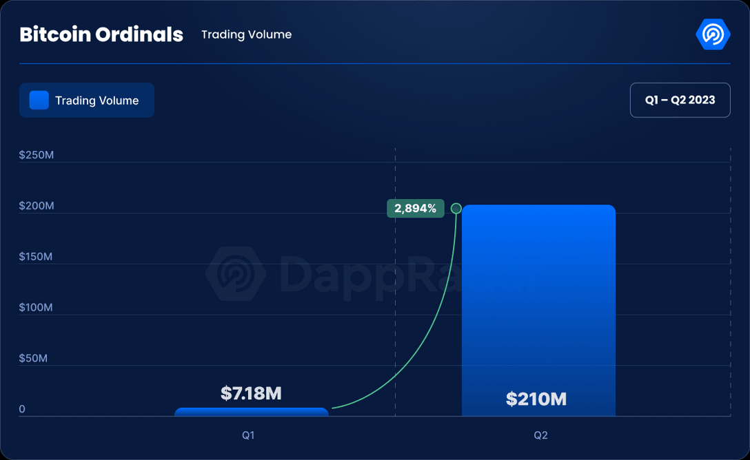 2023 上半年,比特币 Ordinals 受欢迎程度大幅上升,交易额大幅增加就证明了这一点——Ordinals 协议的 NFT 销售额从 2023 年一季度的 718 万美元飙升至二季度的 2.107 亿美元,季度增长幅度达到惊人的 2834% 。此外,比特币 Ordinals 的历史交易量和独立交易者数量也分别达到 554, 215 笔和 150, 969 个,突显了该 NFT 协议的覆盖范围不断扩大以及新交易者对比特币链上数字资产的兴趣日益浓厚。