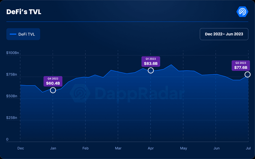 2023 年第二季度,DeFi 总锁仓量(TVL)环比下降 7.1% ,达到约 776 亿美元,与 DeFi 市场预期增长轨迹相比,锁仓量萎缩似乎令人感到有些意外。