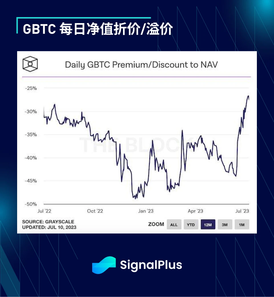 加密货币价格也同样平静;有趣的是,尽管 DCG 仍深陷与各对手方的诉讼纷争中,但得益于各种现货 ETF 申请, Greyscale Trust 长期以来的净值折价在过去一个月已大幅修正 ,目前折价程度已经回到 3 AC/ Celsius 后和 FTX 前的水平。