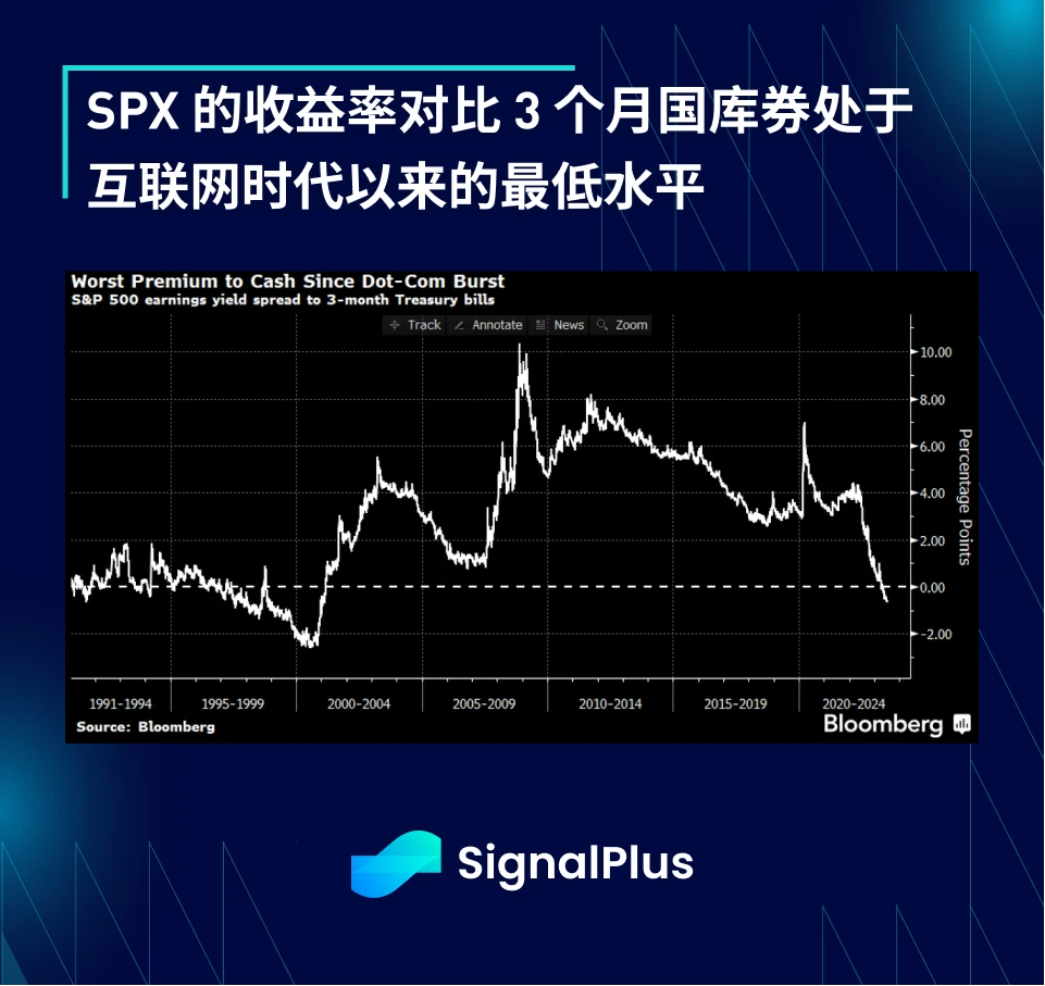 尽管如此,随著债券收益率被重新定价走高, SPX 相对于 3 个月国库券的收益率处于互联网时代以来的最低水平 ,即使经济成功实现全面的软著陆,估值仍可能是股市的持续阻力。