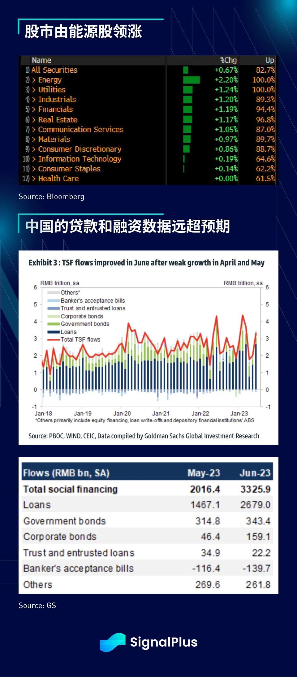 由于近期经济活动数据好于预期,且投资者普遍预期今日 CPI 数据将偏软 ,在全线风险反弹的推动下,S&P 500 指数上涨 0.7% ,收于 4, 400 点上方,随著油价突破 100 日移动平均线,指数主要由能源板块领涨。中国数据方面也出现罕见的优于预期的情况, 6 月份新增人民币贷款(3.2 万亿 vs 预期的 2.25 万亿)、社会融资规模增量(4.22 万亿 vs 预期的 3.0 万亿)和 M 2 数据(同比增长 11.3% vs 预期的 10% )均远高于预期。