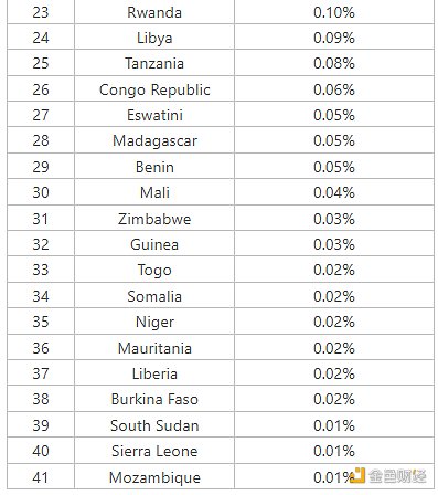 剩下的 48 个非洲国家在整个大陆上对加密货币的兴趣相对较低, 每个国家今年的份额都不到 2.0%。具体来说,今年 54 个非洲国家中只有 41 个国家对加密货币感兴趣,而目前整个非洲有 13 个国家根本没有对加密货币感兴趣。