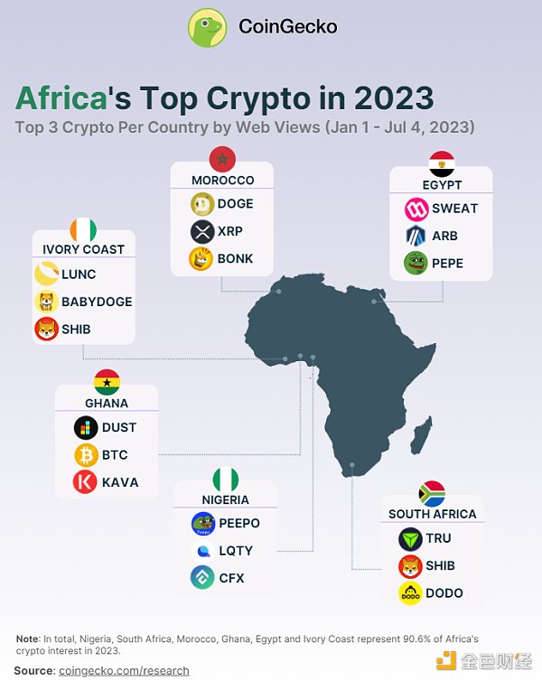 这些非洲国家中的一些也曾出现在全球排名中,尽管通常排在尼日利亚之下:今年早些时候,摩洛哥是对 Meme 币兴趣最多的前十个国家之一,南非在准备金证明的兴趣中排名第 11。埃及也曾被确定为去年 FTX 崩溃影响最大的第 9 个国家。