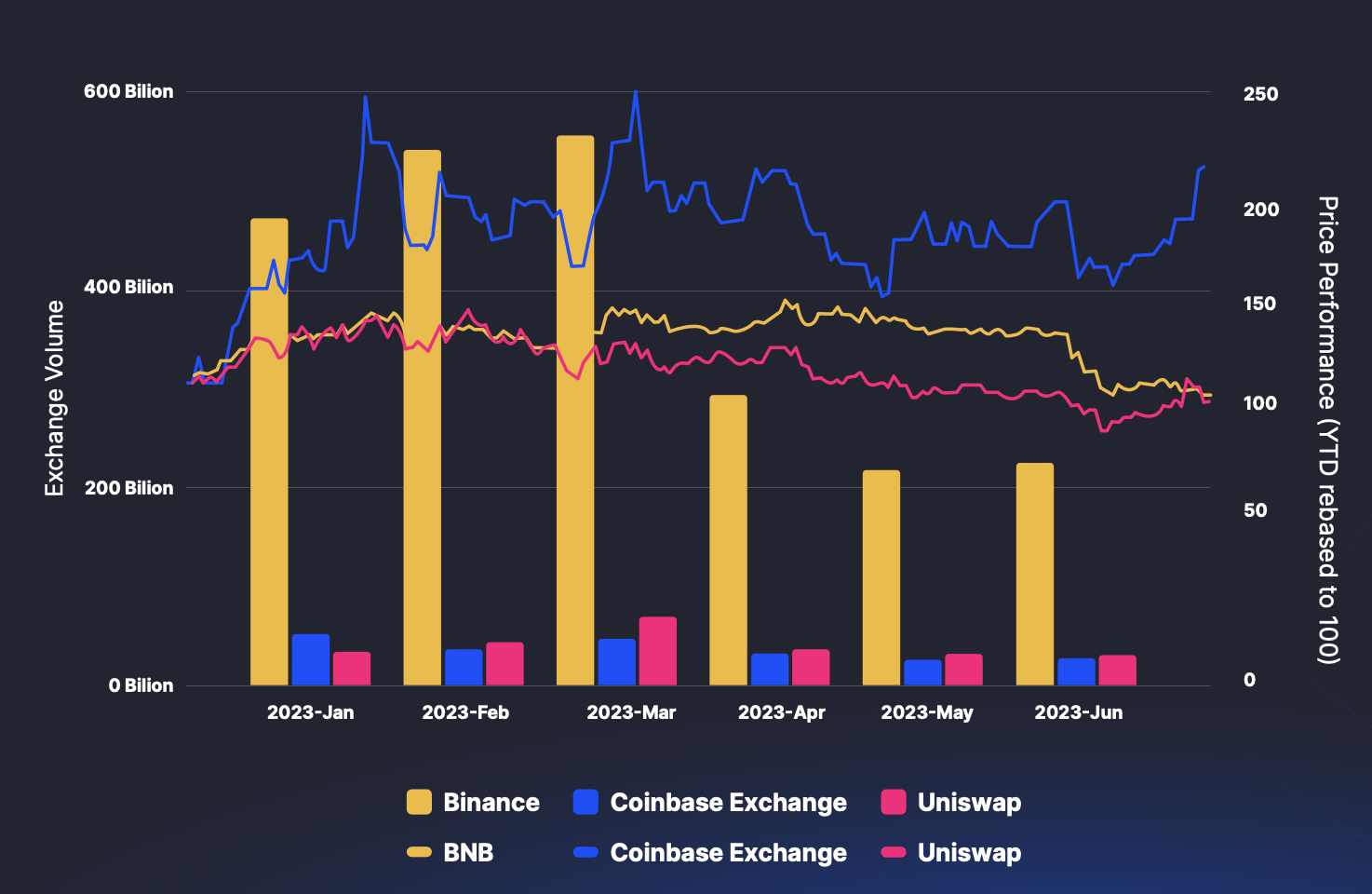 Uniswap 与 Binance 和 Coinbase 交易量及价格表现