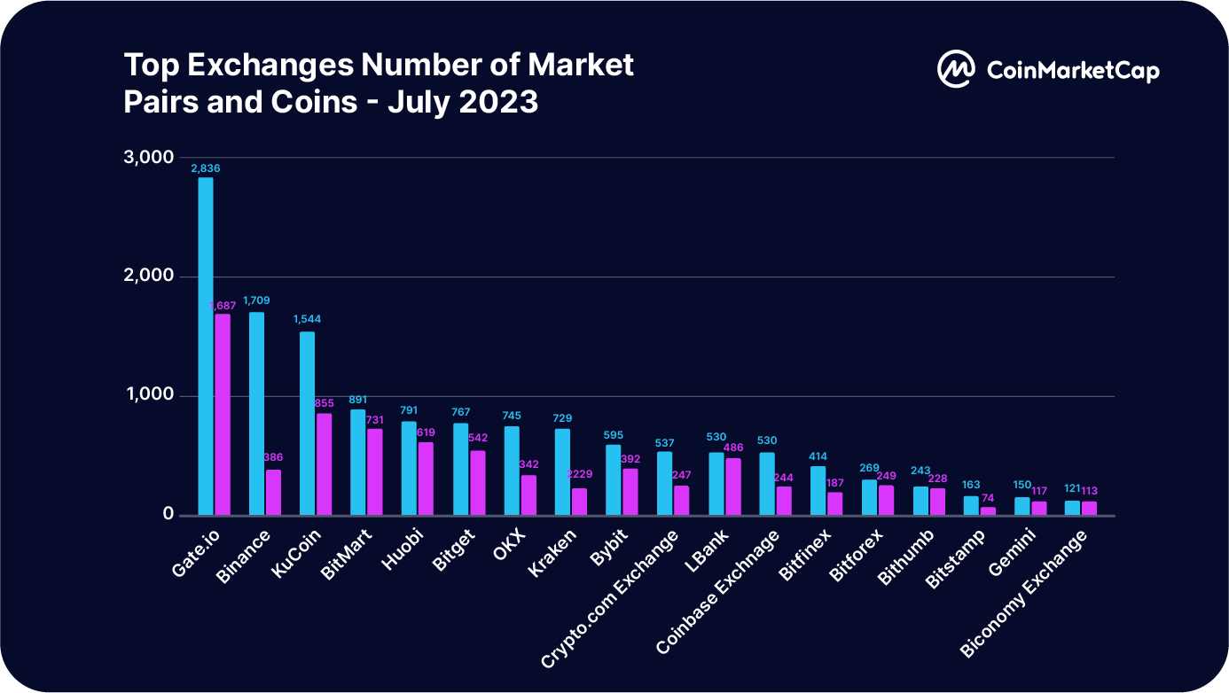 各大交易平台市场交易对和代币数量 - 2023 年七月