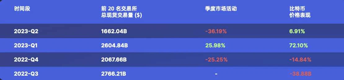 2023 年第二季度,排名前 20 的交易平台在总现货交易量方面贡献了 1.67 万亿美元,较上一季度下降了 36% , 这一下降表明市场活动明显放缓。相比之下 2023 年第一季度 ( 2.6 万亿美元) 比特币价格翻倍推动了当时整体市场的报复性活跃交易活动。