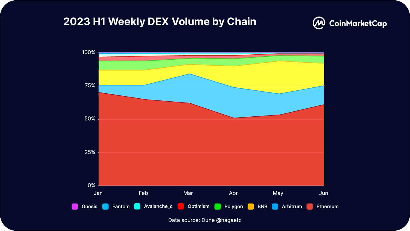 在 2023 年上半年,约 80% 的去中心化交易平台(DEX)交易量发生在以太坊及其 Layer 2 链上。然而,在第二季度,BNB 迅速迎头赶上并获得了 DEX 交易市场的更大份额。