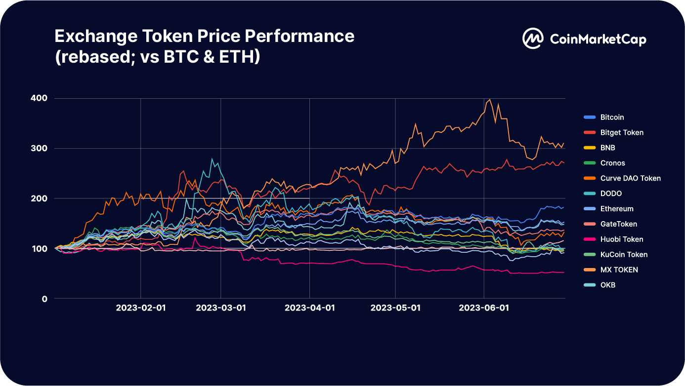 2023 年上半年显示大部分交易平台代币实现了净正回报,然而由于 2023 年上半年比特币涨势强劲, 大多数代币未能超过比特币(年初至今+ 182% )的表现。