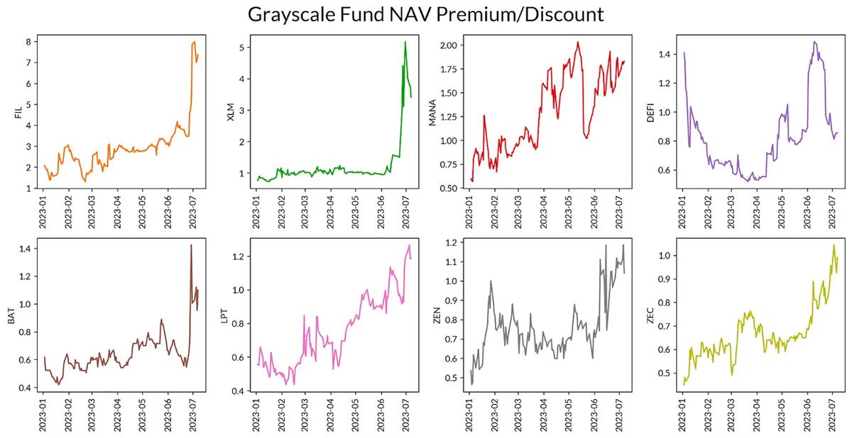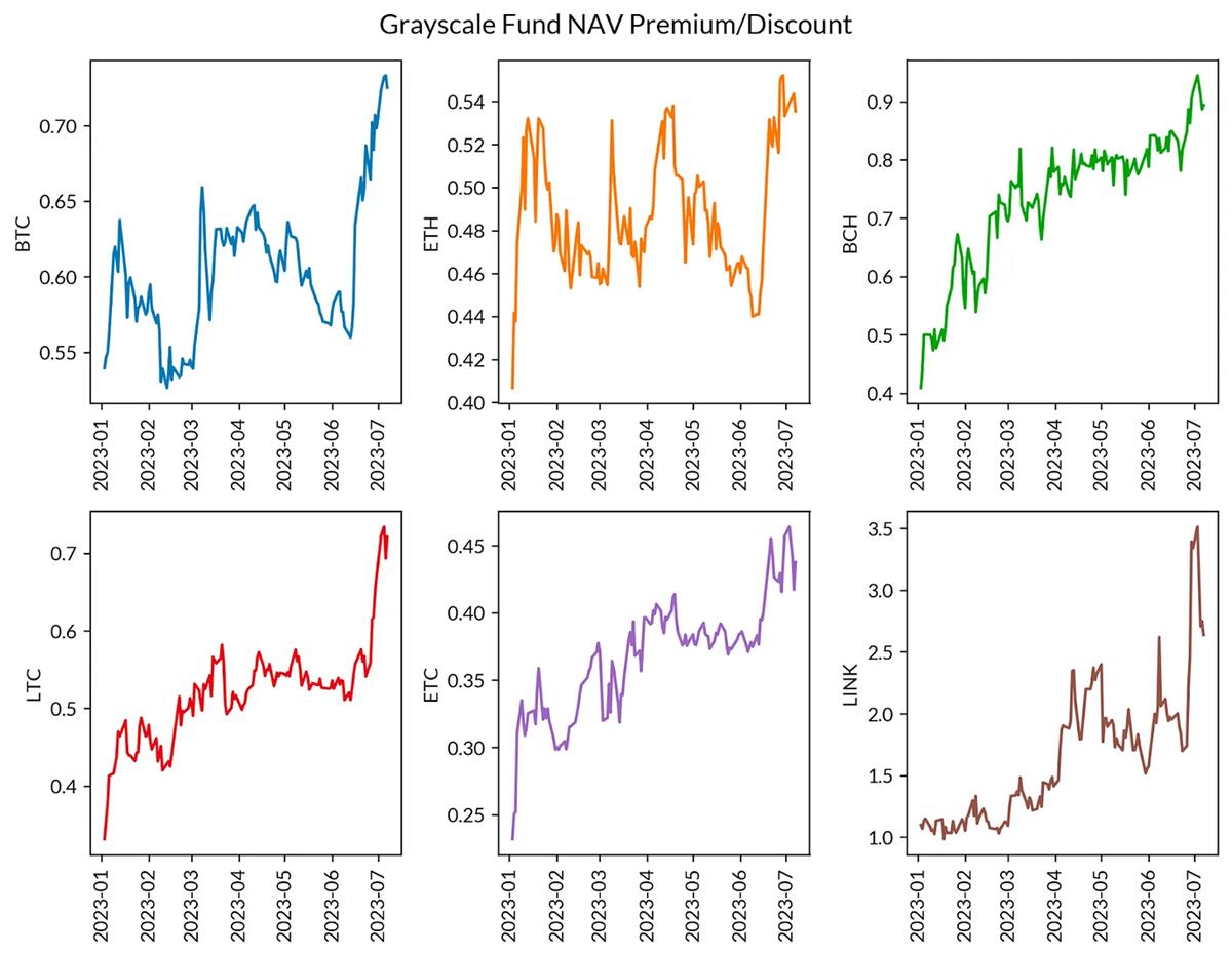 如果我们看一下上面的图表,我们可以看到为不同资产设立的各种信托发展得非常不同。虽然 ETH 的折扣率大约在 50% 左右,但 BTC、BCH、LTC 和 ETC 的趋势更接近平价,而 LINK 实际上超过了平价,以 270% 的溢价交易。这种趋势可能是由于投资者意识到,最近有消息称贝莱德已经申请创建现货比特币 ETF,如果 Grayscale 也获得将这些基金转换为 ETF 的批准,价格将与平价相匹配。虽然我们可能认为这听起来有些牵强(因为这意味着人们支付的价格是现货价格的近三倍),但对于流动性特别差的投资工具来说,这种情况很常见,尤其是当投机性资金流动占主导地位时。我们可以从下面看到 Grayscale 提供的其他信托的相同行为。