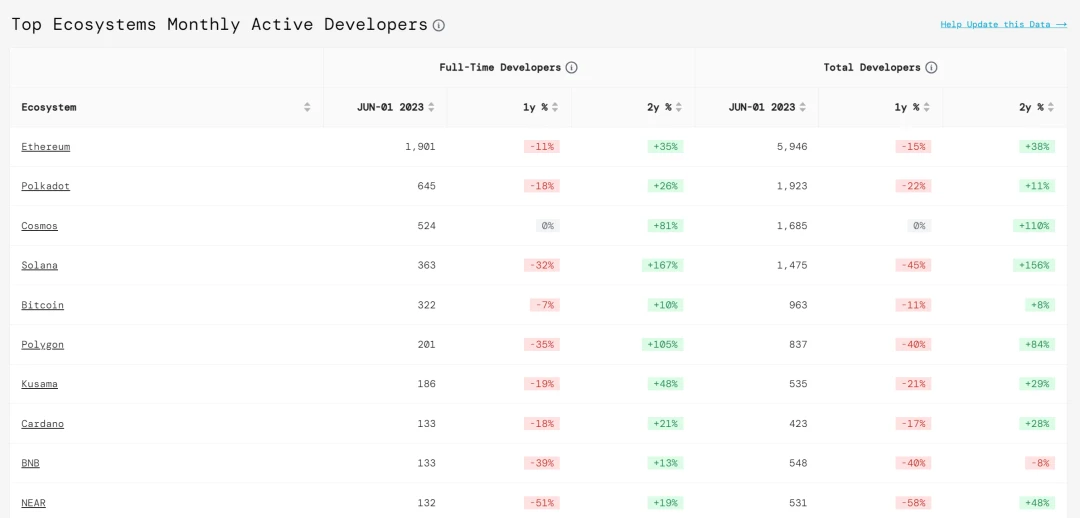 尽管在 FTX 暴雷后有部分开发者选择「出逃」,但整体链上活跃开发者数仍相对稳定且保持前列。