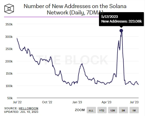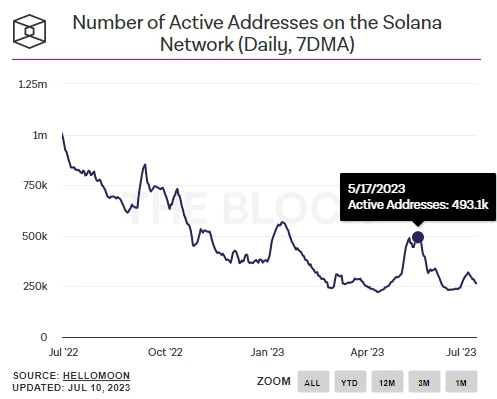 另外,根据相关数据, 5 月,Solana 日活地址数最高达到了 49 万,该数据几乎与去年 11 月 11 日 FTX 正式申请破产时的 50 万日活地址数相当。