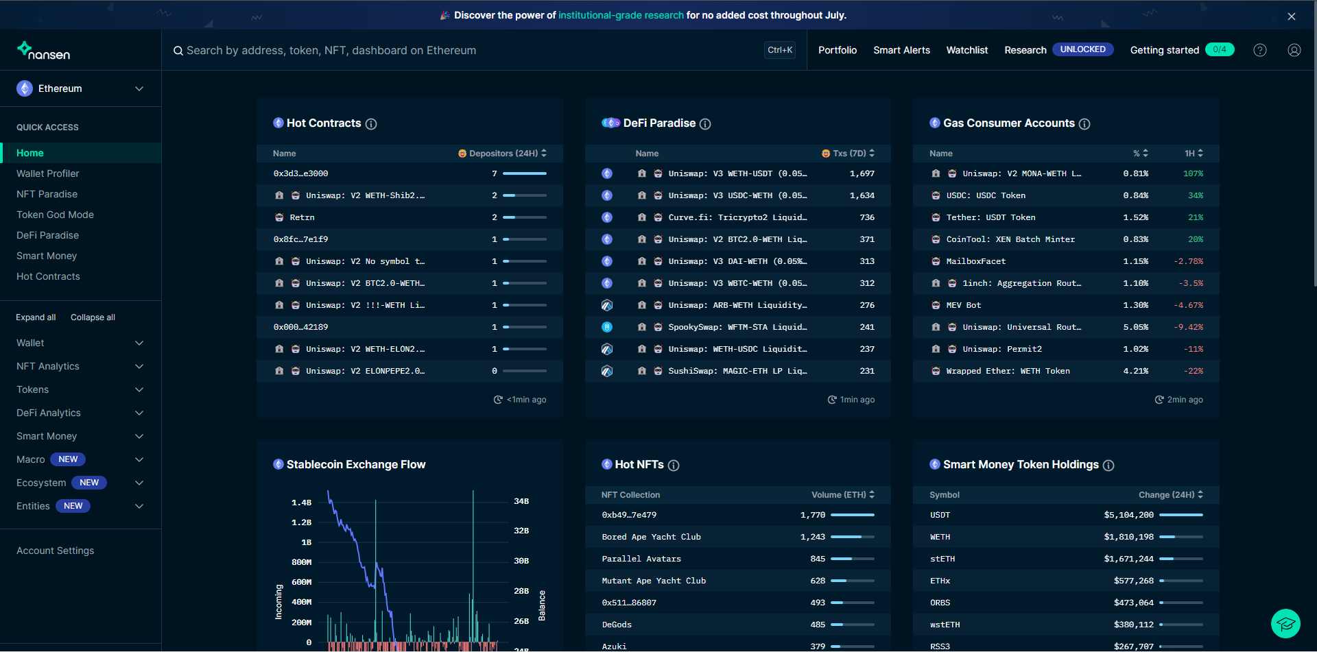 Nansen 专注于提供以太坊网络上的深入见解和数据分析。它的目标是帮助用户更好地了解和解读以太坊生态系统中的活动和趋势,从而做出更明智的决策。
