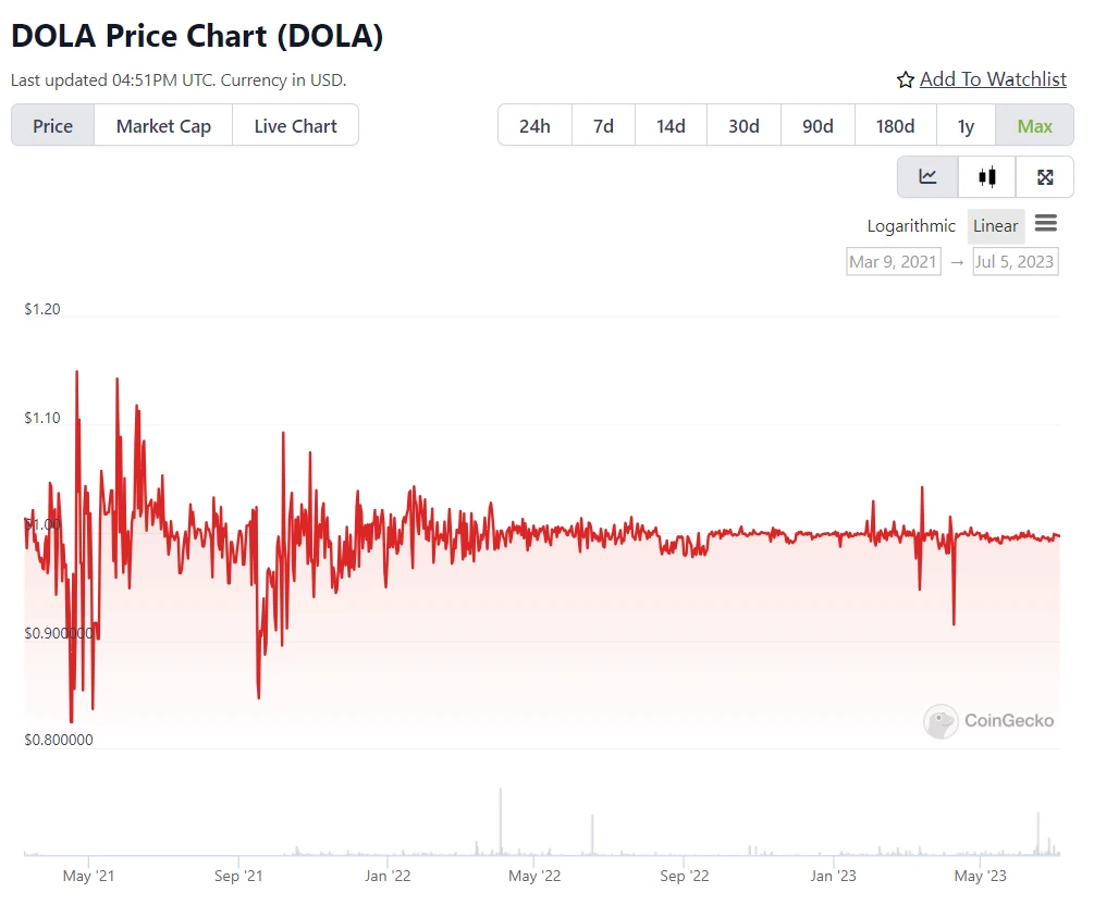 DOLA 在经历“黑客攻击”风波后,自 2022 年 10 月起代币价格已经相对稳定,近期发生两次较大的价格波动,一是 3 月 8 日受 USDC 脱锚事件影响,另一次为 4 月 9 日原因暂时未知。