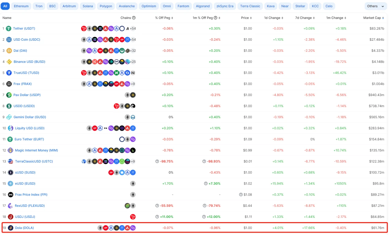 依据 defillama.com 数据,DOLA 在整个稳定币市场市值排名第 19 位,相较去中心化稳定币龙头的 DAI(43.37 亿),仅达到其市值的 1.4% 。