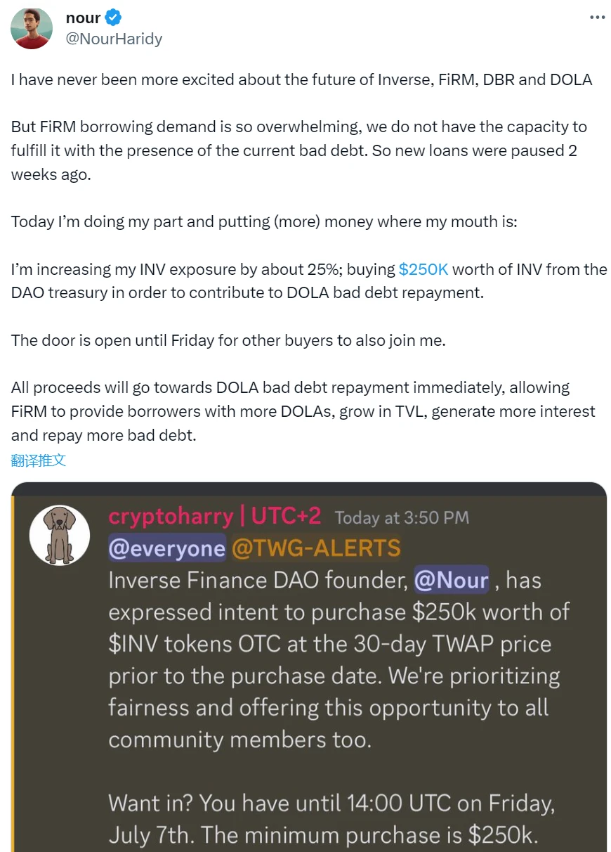 2. 创始人在推特上发布消息称其以 30 天 TWAP 价格向 Treasury 购买价值 25 万美金的 INV,该笔资金会被用于偿还坏账,并欢迎其它买家进行购买,OTC 时间会持续到 7 月 7 日。