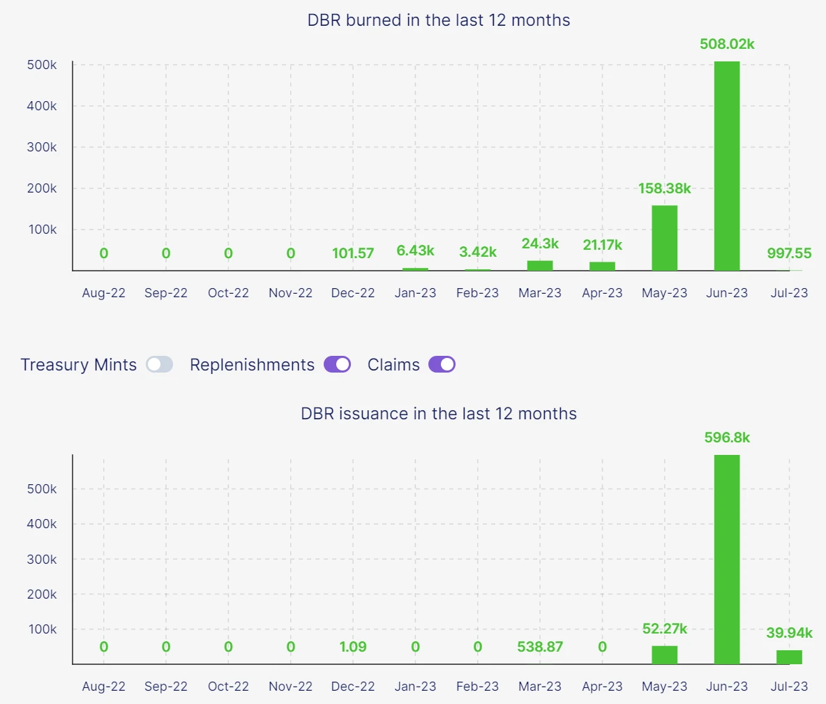 自今年 3 月起,DBR 销毁量明显增加, 6 月因 CRV 和 cvxCRV 资产市场的活跃,销毁量是 5 月份的三倍之多,年化销毁也超过年发行量,DBR 进入通缩。