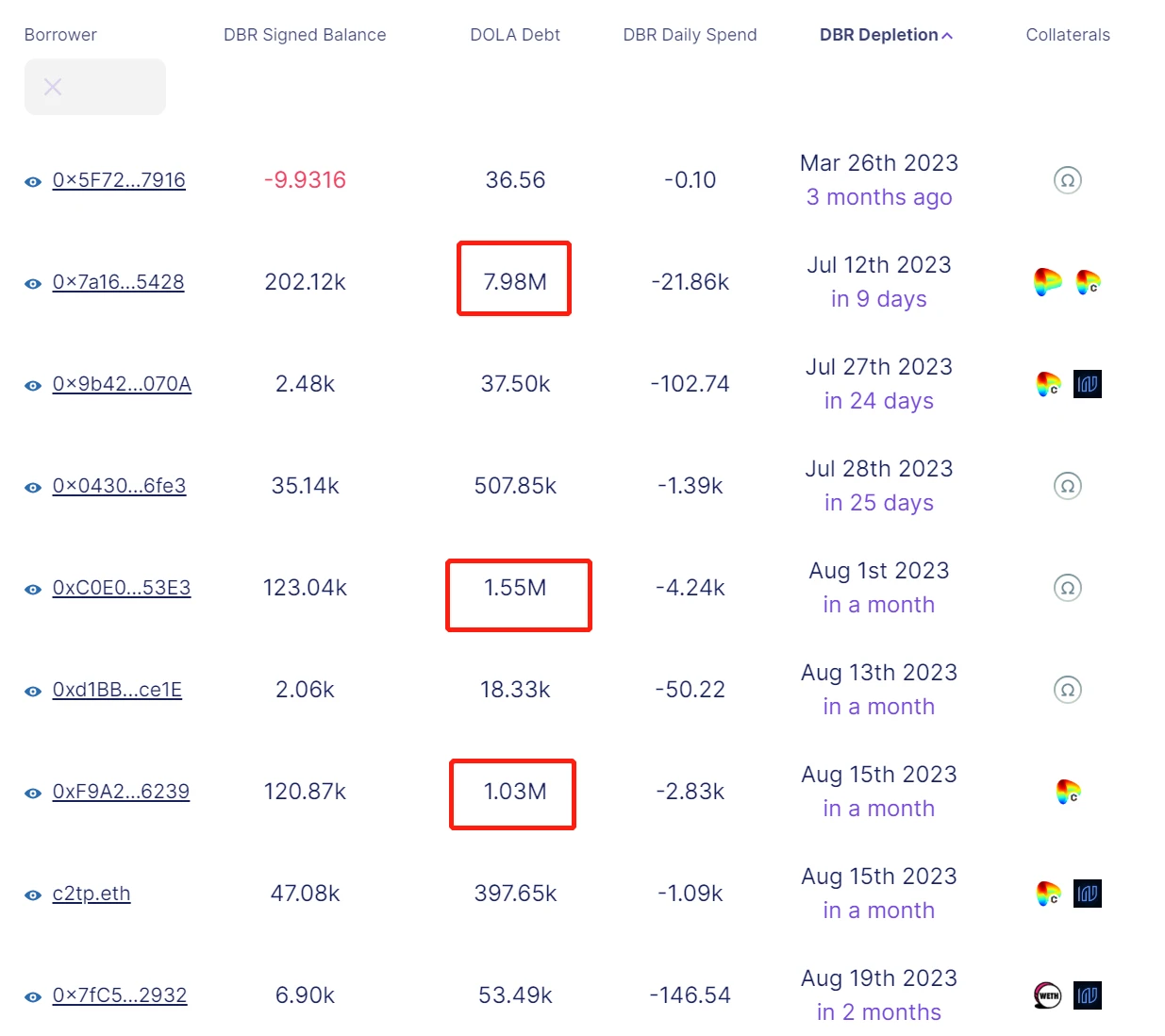 从 DBR 的消耗可以看到近期的主要需求就是 CRV 市场,其次为 OHM, 0x7a16 为 Curve 创始人头寸。