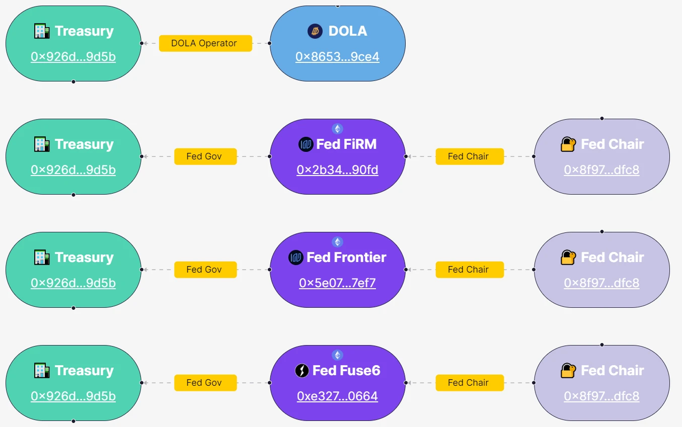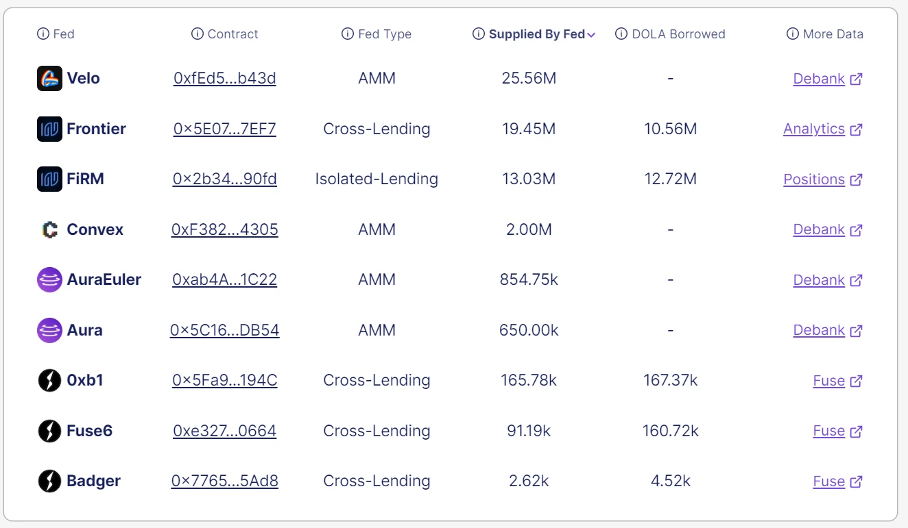 Fed 智能合约由 Inverse DAO 控制,分为三种不同类型,但是都能够铸造 DOLA 并将其直接供应到流动池或者借贷市场中,同时也可提取并销毁 DOLA,从而影响 DOLA 的价格稳定。