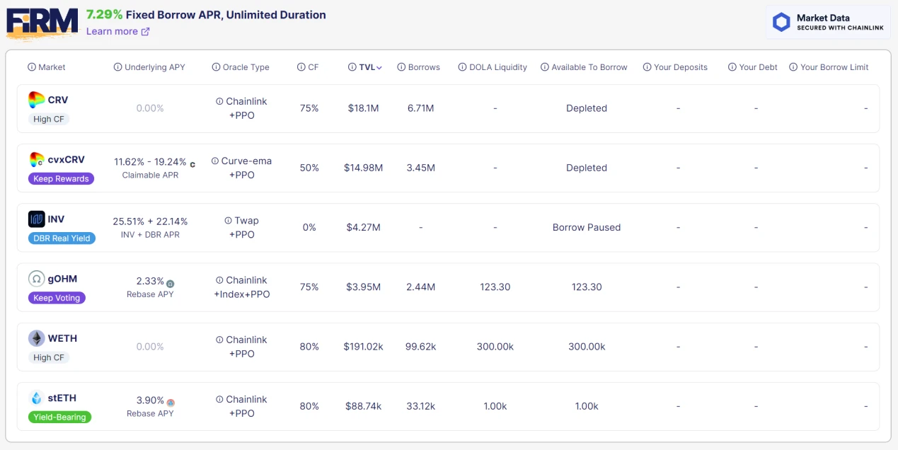 Inverse 当前的主要产品为固定利率借贷市场 FiRM 和稳定币 DOLA。