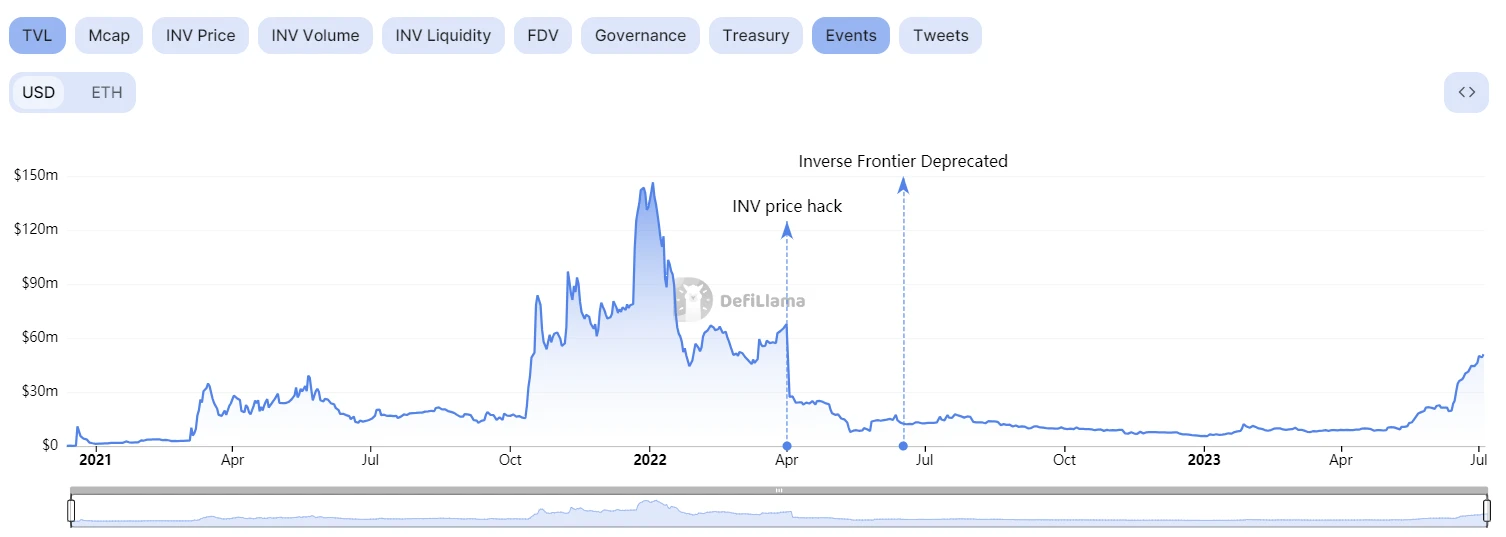 2021 年 2 月,Inverse 与 Anchor 合作发行稳定币 DOLA,但是随着 Terra 生态的崩溃以及 Inverse 先后两次被攻击,现有产品前端被停用。2022 年 10 月,Inverse 推出固定利率借贷产品 FiRM。