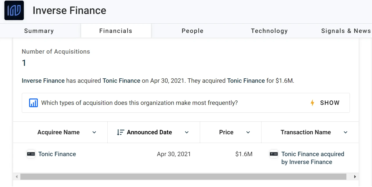 Crunchbase 信息显示,Inverse 曾在 2021 年 4 月 30 日以 160 万美元价格收购 Tonic Finance。