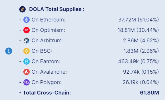 依据官网数据,DOLA 当前发行总量为 6, 180 万枚,其中以太坊上供应 3, 772 万枚,占比 61.04% ,其次为 Optimism ,占比 30.44% 。主要采用场所为 Optimism 上的 DEX Velo 和自己的协议产品 FiRM,DOLA 团队还是比较重视二层的采用。