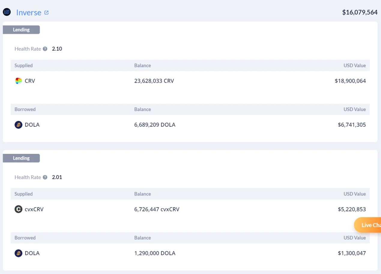 目前仅 Curve 创始人存入约 2, 363 万枚 CRV, 673 万枚 cvxCRV,总价值约 2, 400 万美元左右,借入稳定币 DOLA 约 798 万枚,其个人头寸(1, 608 万美元)在 Inverse 的 TVL 占比就达 31% ,Inverse 协议发展受 Curve 影响较深。