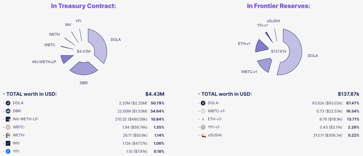 Treasury 持有资产总价值为 457 万美元,包括 Treasury 合约持有的 443 万美元和 Frontier 储备金 13.78 万美元。Treasury 合约中大部分资产为 DOLA,资产价值 225 万美元,其次为 DBR 资产,价值 153 万美元。