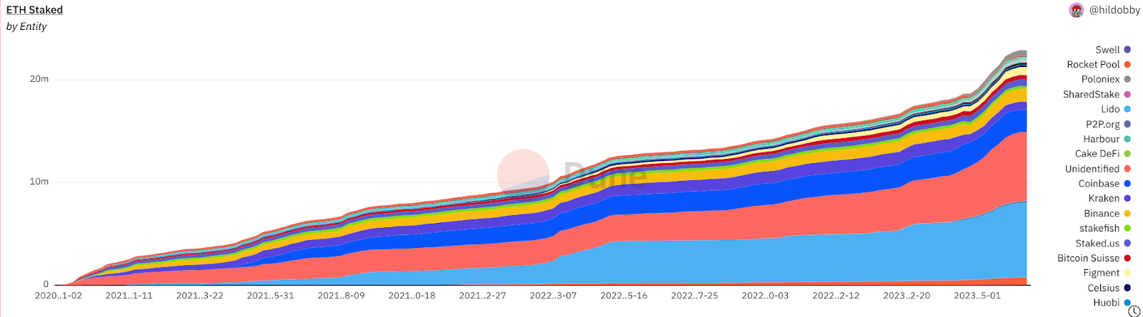 流动质押衍生品 (LSD) 是 2023 年最热门的话题之一。这些协议接受存入的 ETH,将其质押以确保网络安全,并将质押奖励分发给 LSD 持有者(刨除一些费用)。这极大地简化了用户的质押流程,并允许在其他 DeFi 应用中使用 LSD。