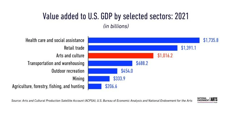 美国是世界主要文化出口国之一,文化(包括艺术)为 GDP 贡献了巨大的价值。2021 年,艺术和文化占美国经济的比重超过 1 万亿美元,增长速度快于其他行业。这不足为奇,因为文化驱动消费,从而影响贸易和零售的几乎所有方面。