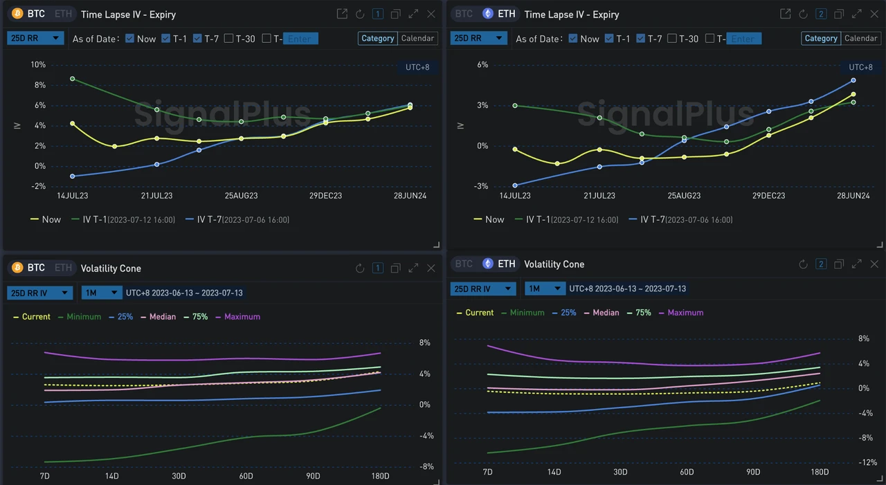 回到期权方面,CPI 数据发布以后,全期限期权隐含波动率大幅下跌,截止今日交割,BTC/ETH 月底 atm 分别降至 38.39% (-4.31% )/ 35.52% (-4.32% ),季度交割降到 43.90% (-2.92% ), 40.25% (-3.06)。16 点后 BTC 整体波动率有所反弹,但整体曲面上仍处于陡势。昨日突然翘起的 Skew 也在今日实现了回归,当前两币种 25 dRR 均在 0 值附近波动,回到了过去一个月的中位数水平。
