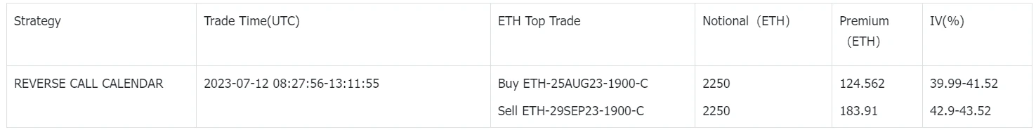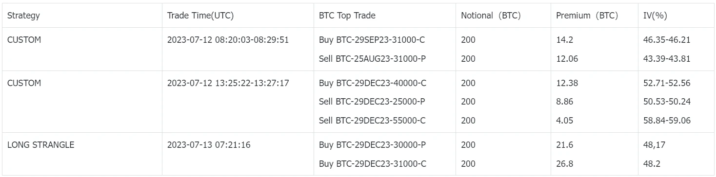 市场整体交易量较昨日有较大提升,大宗交易员持续在 BTC 的远期上进行长线布局,在 31000 点位上有一笔 200 BTC notional 的买入九月/卖出八月日历 RR 策略,与之相对应的是 ETH 上的一组 2250 ETH 买入 25 AUG 23-1900-C,卖出 29 SEP 23-1900-C 的反向策略交易。