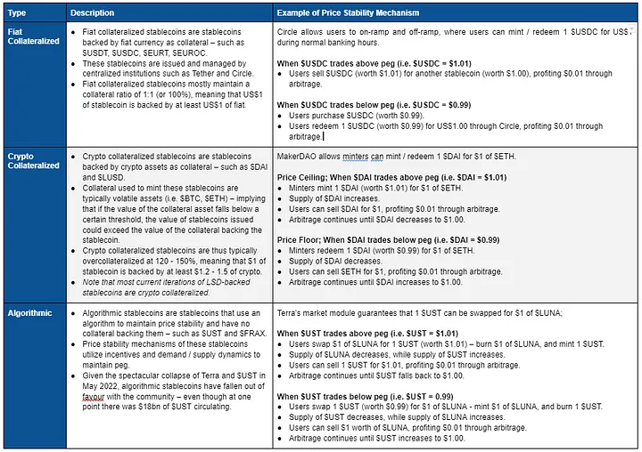 稳定币大致可分为三种类型:1)法币抵押稳定币,2)加密货币抵押稳定币,3)算法稳定币。这些稳定币在发行方式、抵押比例、支持稳定币的基础资产以及价格稳定机制上存在差异。