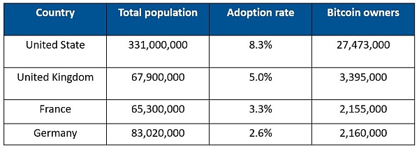 根据一些数据调查,2021年,在英国、法国、德国等国家,比特币标准的采用率远低于加密货币更“出名”的美国。