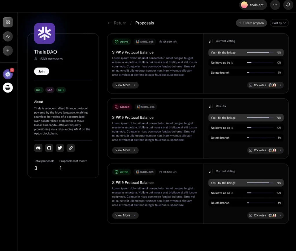 作为 Aptos 上最大的原生协议,Thala 旨在支持的 Aptos 生态系统中缺少的一个部分是新代币的发布($THL 除外)。 Thala 目前有 ThalaLaunch 来促进机械流程,但对于新协议(包括 Thala),没有支持代币投票的治理平台。