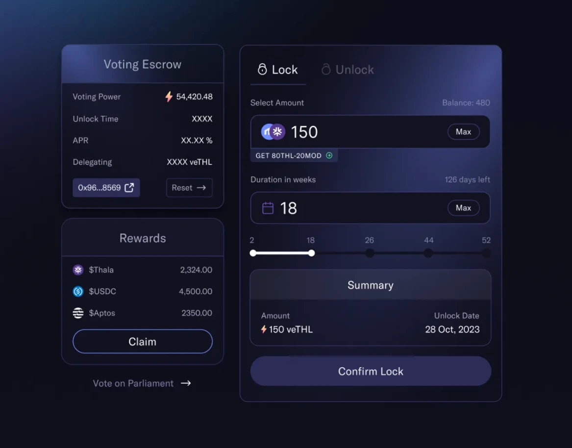 Thala 的投票托管模型在开发过程中经历了额外的变化。 最初的 veTHL 实施仅支持锁定的 LPT ( 80 THL-20 MOD),将迫使用户在没有其他选择的情况下提供流动性。 为了鼓励所有用户参与 Thala 的治理,我们更新的投票托管代币经济学现在支持单边 THL 和 80 THL-20 MOD 流动性池代币。