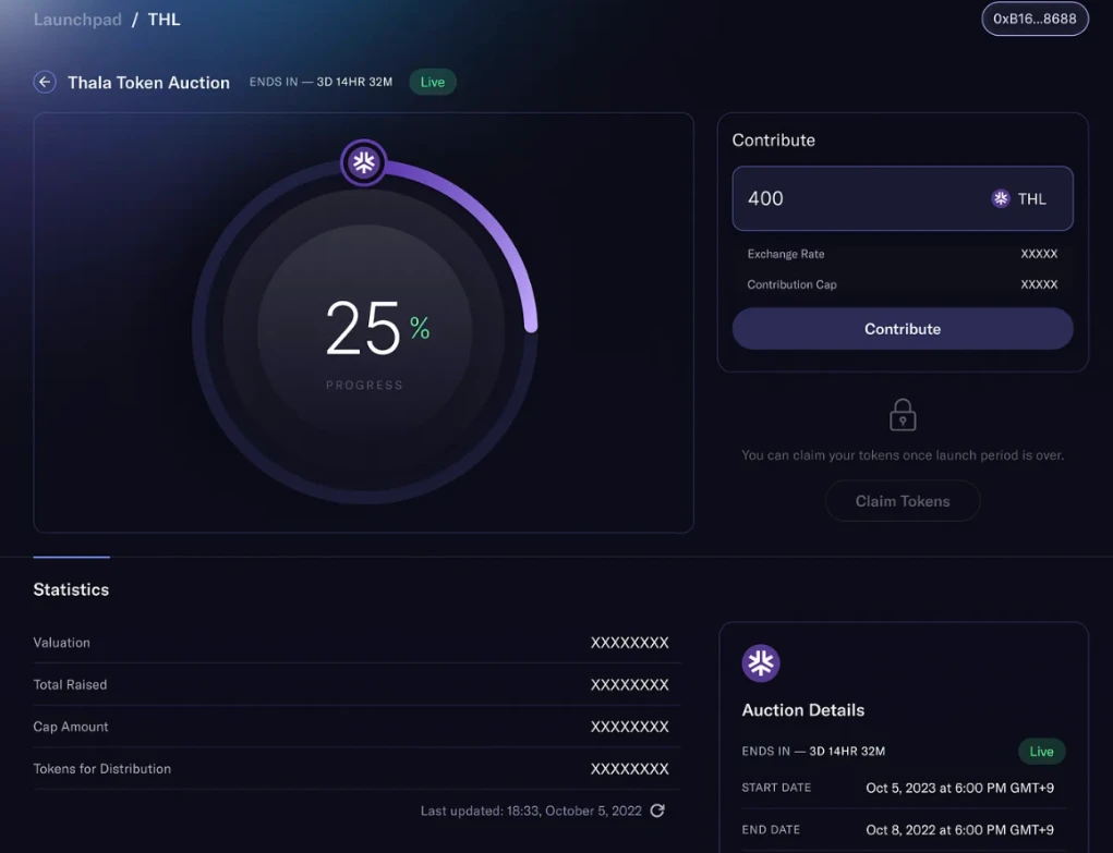 在批量拍卖中,有一个固定的期限,用户可以投入资金以预先确定的估值参与。 一旦该期限结束,所有承诺都会以单一清算价格批量并执行。 如果超额承诺超出上限,所有参与者将按比例收到他们的代币和拍卖退款。 批量拍卖模型与 LBP 模型非常相似,有其优点和缺点。 有了这个新产品,协议可以通过在 Thala Launch 上添加批量拍卖选项来更好地评估其代币发行策略。