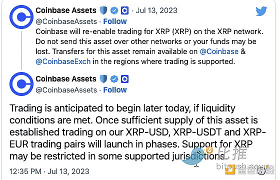 此前已将 XRP 在其交易平台上下架,周四下午宣布将再次允许该资产交易。另一家美国交易所