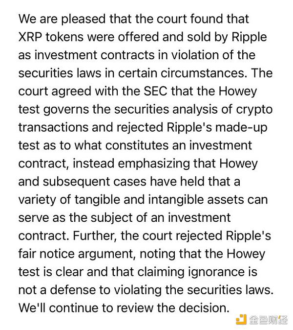 SEC回应称: “法院认为Ripple在某些情况下以违反证券法的投资合约形式提供和销售XRP代币,我们对这部分裁决表示满意, 法院同意了美国证券交易委员会(SEC)的观点,即Howey测试可用于分析加密交易是否为证券,并且拒绝了Ripple对于什么构成投资合约的自我测试,而是强调了Howey以及随后的案例已经裁定各种有形和无形资产可以作为投资合约标的。此外,法院驳回了Ripple的公平通知论点,指出Howey测试是明确的,声称不知者无罪并不能成为违反证券法的抗辩。我们将继续权衡法院的这项决定”。