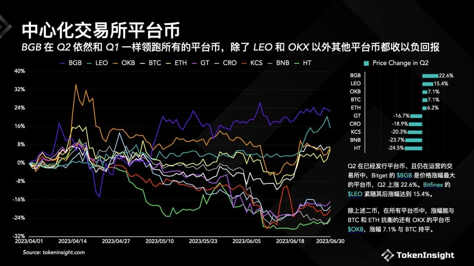 在已经发行平台币、且仍在运营的交易所中,Bitget 的 $BGB 在 Q2 的价格涨幅最大,达 22.6% 。 Bitfinex 的 $LEO 紧随其后,涨幅达 15.4% 。