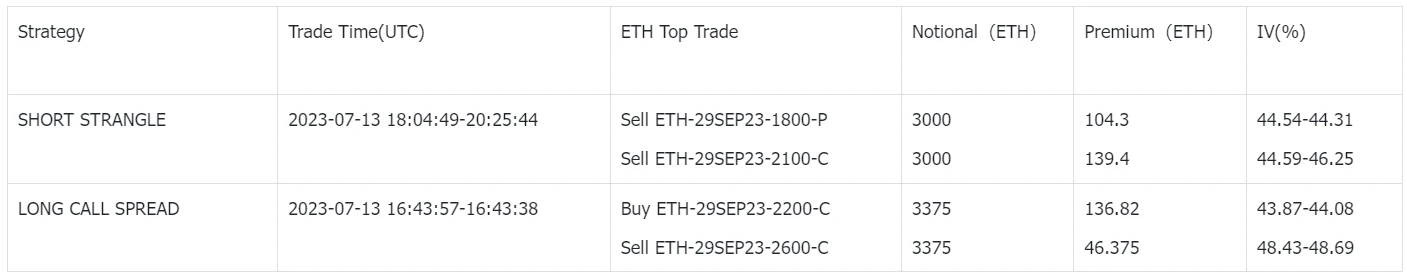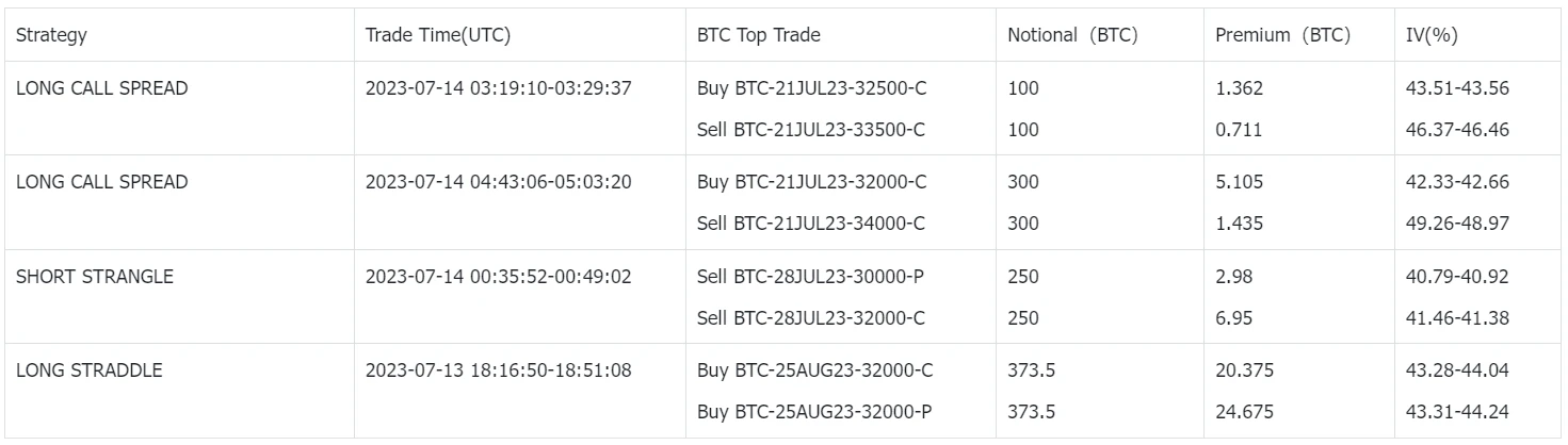大宗交易方面,前段时间源源不断的远期大宗看涨实现了他们的回报,在今日仍能看到交易员对上涨势能的持续下注,包括 BTC 下周 100 组 32500/33500 , 300 组 32000/34000 Long Call Spread,还有 ETH 远期 29 SEP 23 上 3375 组 2200/2600 Call Spread。除此之外,累计 373 BTC 的八月 32000 Long Straddle 策略在 BTC 价格接近 32000 的关口附近时被建起。而后,随着市场热情的逐步冷却,BTC/ETH 都出现了大量看跌波动率策略(BTC Short 28 JU L 2 3 30000/32000 Strangle,ETH Short 29 SEP 23 1800-2100 Strangle),收回了这波由流动性带来的 Vol Premium 溢价。