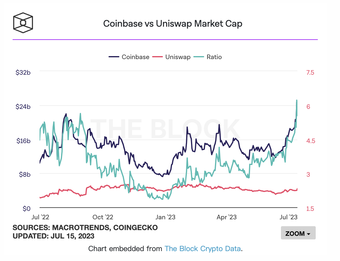 Coinbase与Uniswap市值之比于7月13日达到6.2的年度高点