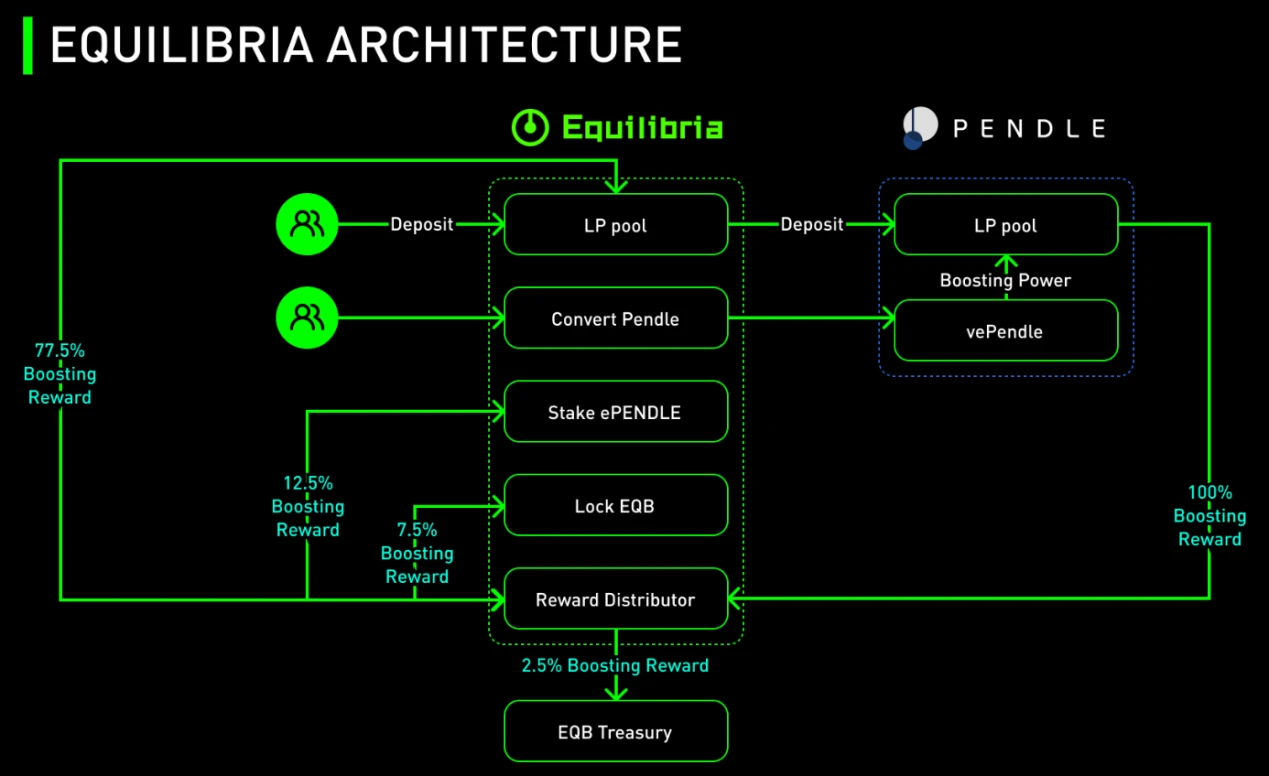 通过 Equilibria 实现挖矿 boost 后, 77.5% 分配给 LP, 12.5% 分配给 ePendle holder, 7.5% 分配给 vlEQB holder,Treasury 获取 2.5% 。每个角色分配的收入比例有设定其范围。