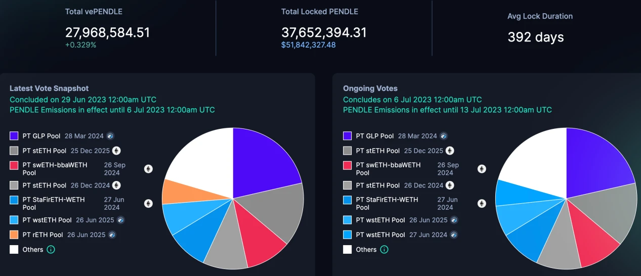 截至 7 月 3 日,PENDLE 锁定量为 3700 万枚,平均锁定时间为 392 天。