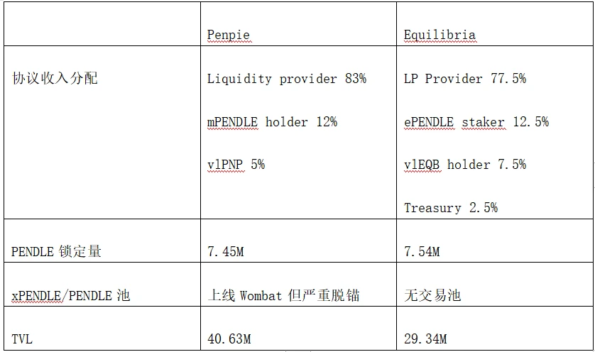 Penpie 和 Equilibria 均是在 Pendle veToken 经济模型基础上提高 LP 收益的辅助协议,LP 不需要质押 Pendle 即可获得 Pendle 挖矿 boost 收益。两者的业务模式并无太大区别。