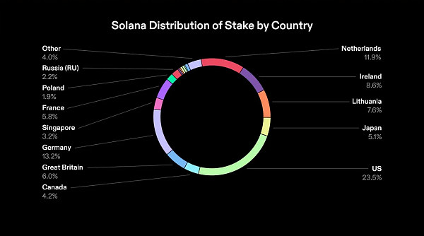 Solana 的质押情况按国家分布如下:美国 23.5% 、英国 13.2% 、爱尔兰 11.9% 、立陶宛 8.6% 、日本 7.6% 、加拿大 6.0% 、新加坡 5.8% 、波兰 5.1% 、荷兰 4.2% 、德国 3.2% 、法国 1.9% 以及 俄罗斯 2.2% ,最后剩余的 4% 来自其他国家。如下所示: