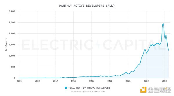 根据 Electric Capital 开发者报告的最新数据,截至 2023 年 4 月,Solana 拥有 1, 234 名活跃开发者;活跃开发者同比下降 12% ,但这一数字比两年前增加了 339% 。