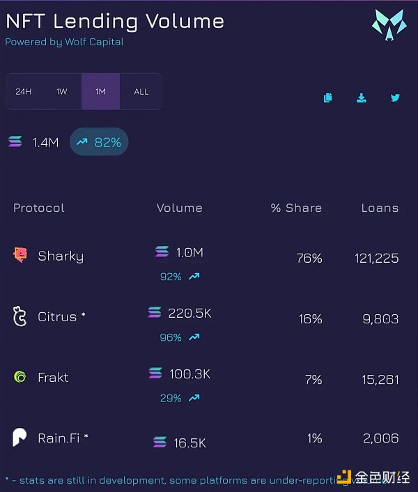 Solana NFT 借贷生态系统正在快速发展。在过去 30 天,贷款量相当于 Solana NFT 交易量的 50% 。Solana 上的主要借贷平台有 Sharky、Citrus、Frakt 和 RainFi。 Sharky 在借贷市场占据 76% 的主导地位,其次是 Citrus(16% )、Frakt(7% )以及 RainFi(1% )。