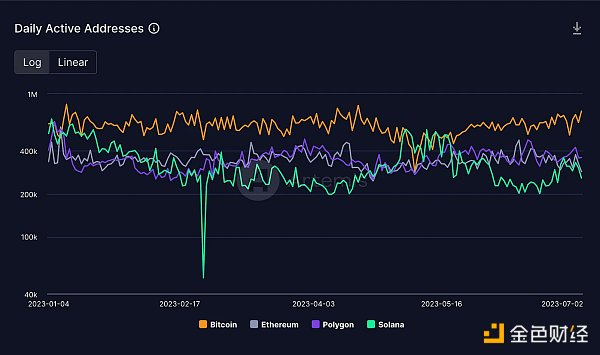 Solana 在 2023 年前 6 个月表现出了韧性,平均每日活跃地址数为 30 万个。Solana 与以太坊和 Polygon 的活跃地址相当,略低于比特币的平均水平。需要注意的是,FTX 崩盘发生在 2022 年底,上面的数据也表明 Solana 用户群并未像预期那样减少。