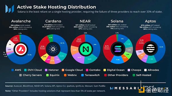Solana 不仅是去中心化的,而且比大多数区块链(如 Avalanche、Cardano、NEAR 和 Aptos)更加去中心化。活跃质押托管(Active Stake Hosting)分布是最平衡的分布之一,这进一步证明了 Solana 的弹性和去中心化性。